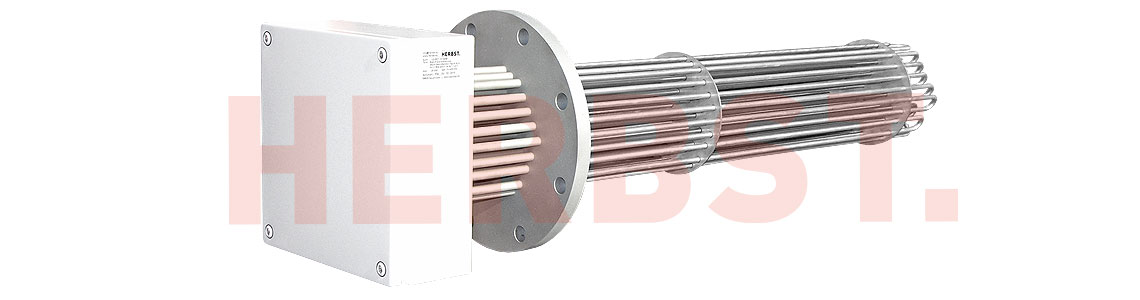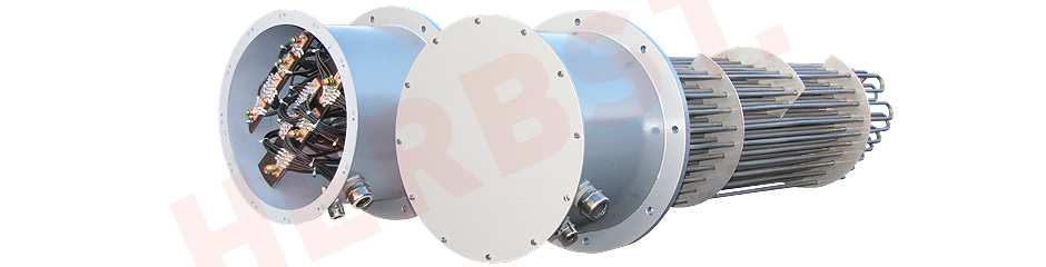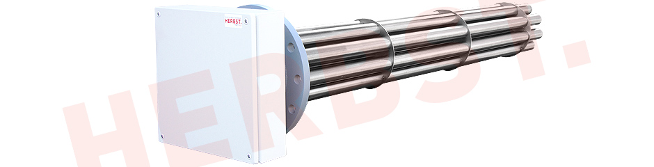 Electric process heaters with 80 kW output and an immersion depth of 1100 mm. The process heaters are resistant to lyes and alkalis and preheat a tank with respective liquid. All electrical connections for operation are located in the welded on steel housing.