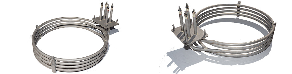 Tubular heaters in customized bending shape for heating convection ovens on ships, direct current operation.